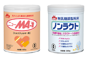 「ニューMA-1」は牛乳のたんぱく質を高度に酵素消化し、ミルクのアレルゲン性を著しく低減した医師の指示によりお使いいただくミルクアレルギー疾患用のミルクです。「ノンラクト」は風邪や胃腸炎などによる一過的なものを含む乳糖不耐症により、一般の育児用ミルクでは下痢や腹痛などの異常をきたす赤ちゃんにご使用いただくミルクで、医師に乳糖、ガラクトースの摂取制限を指示された場合にお使いいただくミルクです。