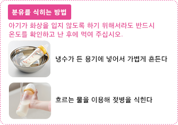 젖병을 흐르는 물로 식히거나 냉수가 들어 있는 용기에 넣어 가볍게 흔들어서 체온 정도의 온도까지 반드시 식혀 주십시오. 분유의 온도는 팔목 안쪽에 떨어뜨려 보고 약간 따뜻하게 느낄 정도(40℃ 정도)가 적당합니다.