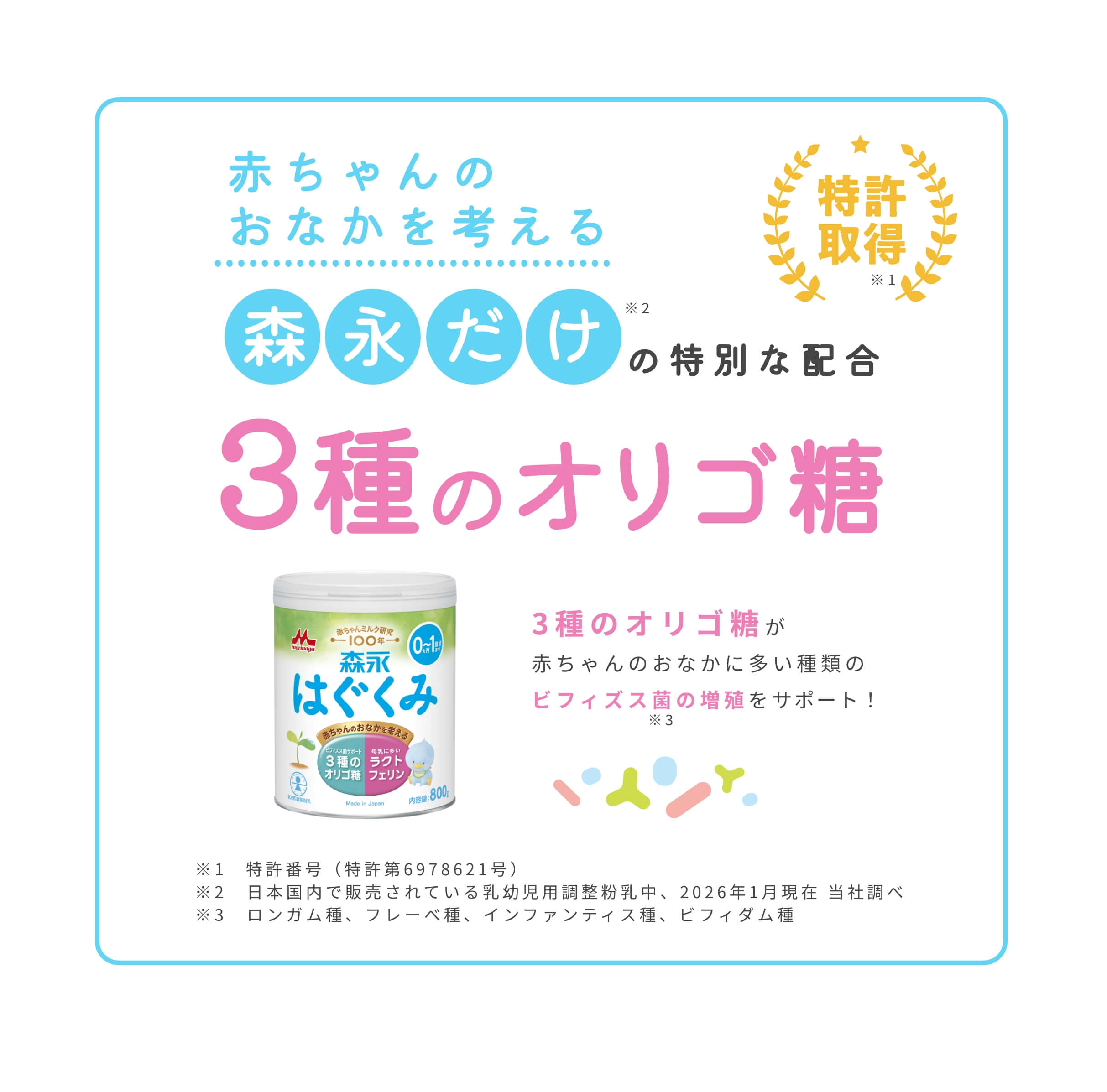 「はぐくみ」・「E赤ちゃん」は、ビフィズス菌をサポートするオリゴ糖3種類の特別な組み合わせが入っています。